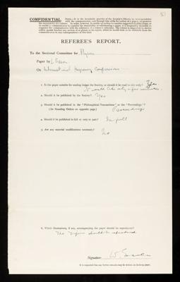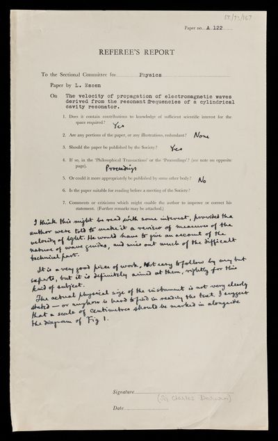 Referee's report by Charles Darwin, on a paper 'The velocity of propagation of electromagnetic waves derived from the resonant frequencies of a cylindrical cavity resonator' by Louis Essen