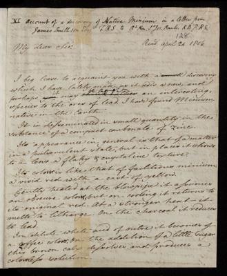 Letter, 'Account of a discovery of native minium' from James Smithson to Joseph Banks