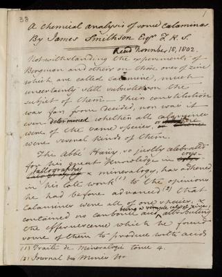 Paper, 'A chemical analysis of some calamines' by James Smithson