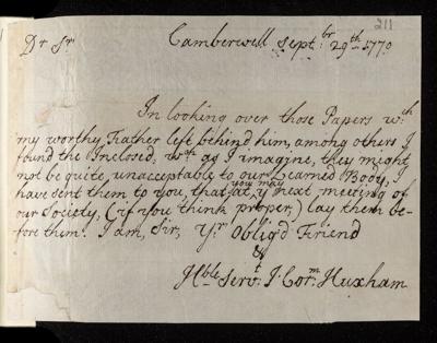 Letter, 'About his late father's papers' from John Corham Huxham to the Royal Society