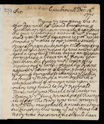 Letter, 'On the body of Sir Reginald Bray, K.G., exhumed in Bury chapel, Windsor (in a suit of armour, temp Henry VII)' from John Corham Huxham