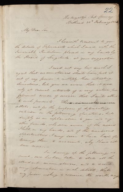 Letter, 'Communicating the details of experiments made with an invariable pendulum, at various places on the South American station' by Captain Basil Hall to Captain [Henry] Kater