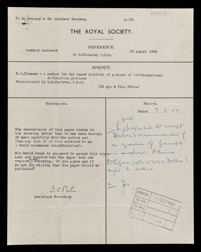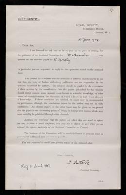 Letter from Robert Stoneley, on three papers 'Large elastic deformations of isotropic materials. Parts I, II, and III' by R S Rivlin to J D Griffith Davies, Assistant Secretary of the Royal Society