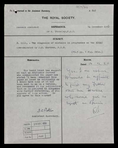 Referee's report by Robert Stoneley, on a paper 'Tides in oceans bounded by meridians IV. Series solutions in terms of angular width of ocean: semidiurnal tides in narrow oceans V. Solutions by use of finite differences: semidiurnal tides' by Arthur Thomas Doodson