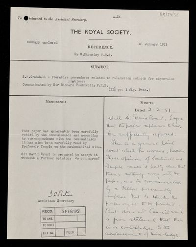 Letter from Robert Stoneley, on three papers 'Large elastic deformations of isotropic materials. Parts I, II, and III' by R S Rivlin to David Christie Martin, Assistant Secretary of the Royal Society