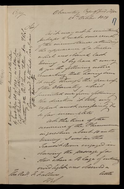 Copy of draft letter, from Sir John Herschel to Fearon Fallows, dated at Downing St.