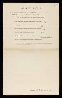 Referee's report by Charles Thomson Rees Wilson, on a paper 'The development of the spark discharge' by Thomas Edward Allibone and J M Meek