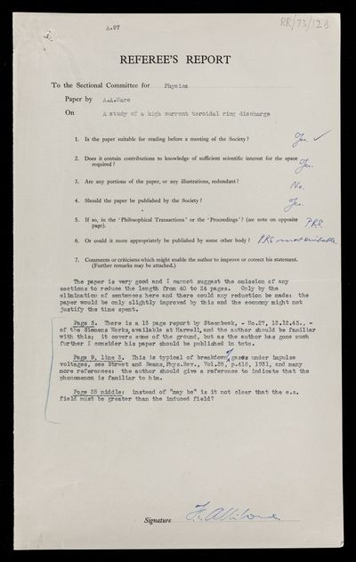 Referee's report by Thomas Edward Allibone, on a paper 'A study of high-current toroidal ring discharge' by A A Ware