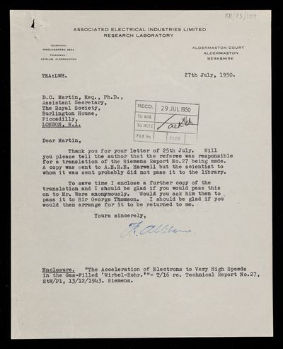 Letter from Thomas Edward Allibone, on a paper 'Constitution and mechanism of the selenium rectifier photocell' by J S Preston to D C Martin, Assistant Secretary of the Royal Society