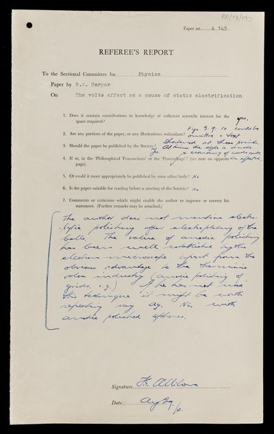 Referee's report by Thomas Edward Allibone, on a paper 'The volta effect as a cause of static electrification' by W R Harper