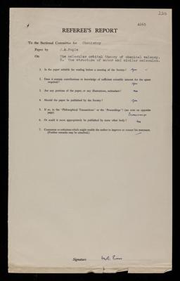 Referee's report by Meredith Gwynne Evans, on a paper 'The molecular orbital theory of chemical valency. V. The structure of water and similar molecules' by John Anthony Pople