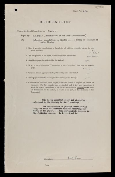 Referee's report by Meredith Gwynne Evans, on a paper 'Molecular association in liquids. III. A theory of cohesion of polar liquids' by John Anthony Pople