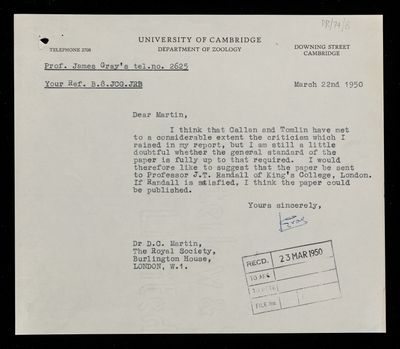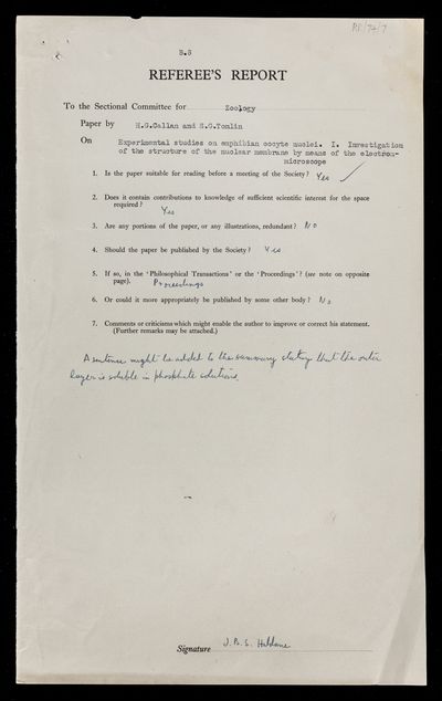 Referee's report by John Burdon Sanderson Haldane, on a paper 'Experimental studies on amphibian oocyte nuclei. I. Investigation of the structure of the nuclear membrane by means of the electron-microscope' by Harold Garnet Callan and S G Tomlin