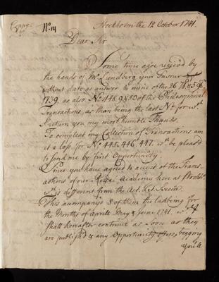 Letter, 'Concerning exchange of transactions with the Royal Society of Sweden' from Martin Triewald to Cromwell Mortimer
