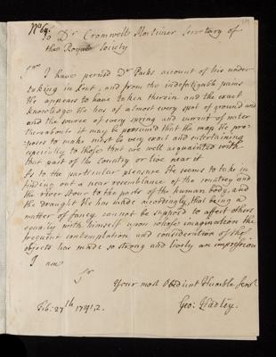 Letter, 'Criticism of a paper on springs by Dr Park' from George Hadley to Cromwell Mortimer