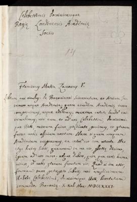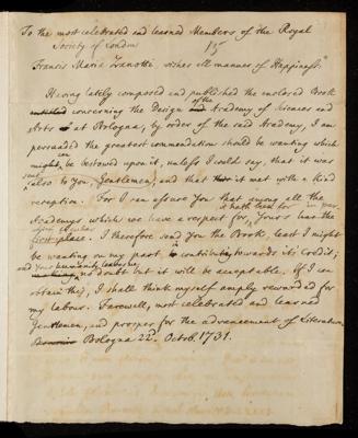 Letter, from Francis Maria Zanotti to the Royal Society, dated at Bologna