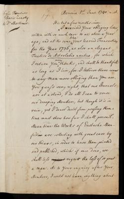 Letter, from Francis Maria Zanotti to Cromwell Mortimer, dated at Bologna