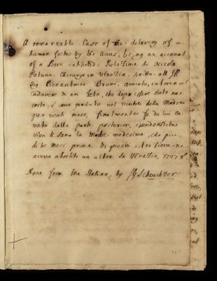 Paper, 'Case of the delivery of a human foetus through the anus from "Relazione di Nicolo Patuna...."' translated by [John Gaspar] Scheuchzer