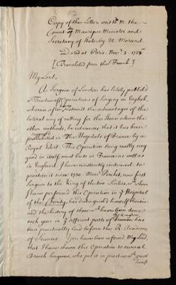 Translation of a letter, from Morand to the Count [Jean-Frédéric Phélypeaux] de Maurepas, dated at Paris