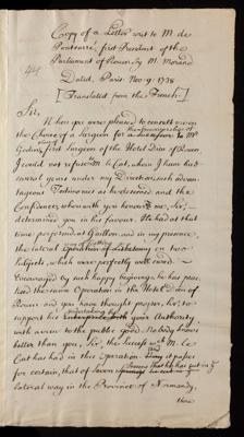 Translation of a letter, from Monsieur [Geoffroy Macé Camus] de Pontcarre to [Sauveur-Francois] Morand