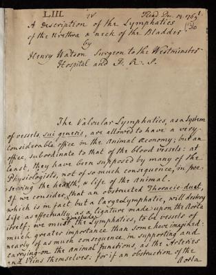 Paper, 'Of the lymphatics of the urethra and the head of a bladder' by Henry Watson