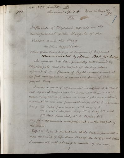 Paper, 'Influence of physical agents on the developement [sic] of the tadpole of the triton and the frog' by John Higginbottom