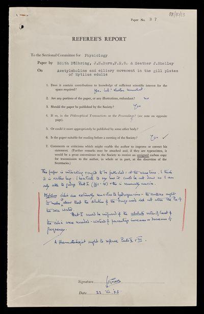 Referee's report by Charles Arthur Lovatt Evans, on a paper 'Acetylcholine and ciliary movement in the gill plates of Mytilus edulis' by Edith Bulbring, Joshua Harold Burn and Heather J Shelley