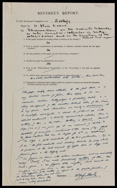 Referee's Report by W E [Wilfrid Edward] le Gros Clark on a paper 'Observations on the acoustic tubercles or lobi-acustico-laterales in bathypelagic fishes and on the function of the lateral line organ' by H Muir Evans