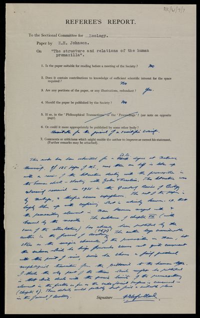 Referee's Report by W E [Wilfrid Edward] Le Gros Clark on a paper 'The structure and relations of the human premaxilla' by E H Johnson