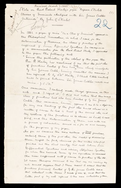 Paper, 'Note on Rev Robert Harley's paper "Professor Malet's classes of invariants identified with Sir James Cockle's criticoids"' by John C [Christian] Malet