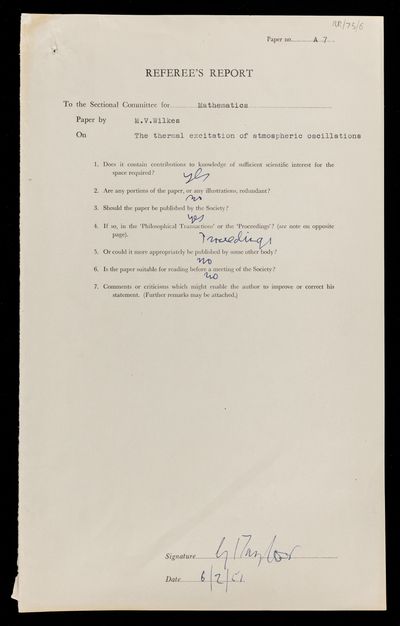 Referee's report by Geoffrey Ingram Taylor, on a paper 'The thermal excitation of atmospheric oscillations' by Maurice Vincent Wilkes