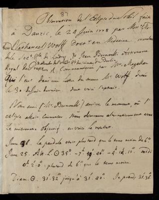 Paper, 'Observations de l'eclipse du soleil faites a Dantzic le 24 Juin 1778 [Observations of the eclipse of the sun made at Dantzic on June 24, 1778]' by N M Wolff and Jean Bernoulli