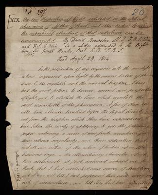 Unpublished letter, 'On a new property of light possessed by the second surfaces of transparent bodies' from David Brewster to Sir Joseph Banks