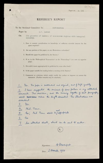 Referee's report by Harold Davenport, on a paper 'The geometry of numbers of non convex regions with hexagonal symmetry' by B P Bambah