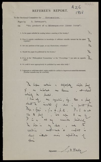 Referee's Report by [Godfrey Harold] Hardy on a paper 'On the product of n inhomogenous linear forms' by [Harold] Davenport