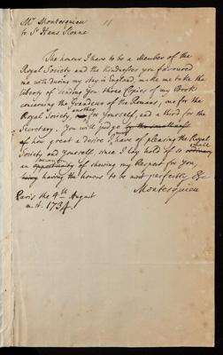 Letter, from [Charles-Louis de Secondat de] Montesquieu to Hans Sloane, dated at Paris