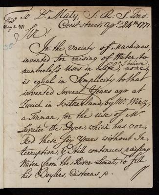 Letter, 'Of Mr Wirz's machine for raising water' from R Valltravers to Matthew Maty