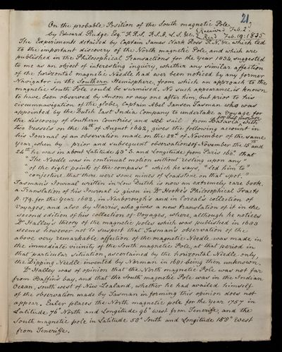 Unpublished paper, 'On the probable position of the south magnetic pole' by Edward Rudge