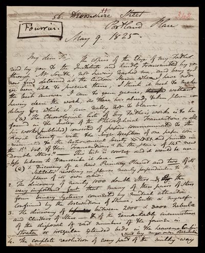 Draft letter, from Sir John Herschel to Jean Baptiste Joseph Fourier, dated at 56 Devonshire St.