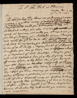 Letter, from John Finch to Henry Oldenburg, dated at Florence